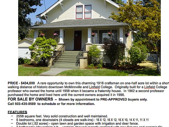 Charming 1916 Craftsman bungalow on one half acre lot within a short distance of downtown McMinnville and Linfield College. Park like back yard with plenty of room for recreation and gardening. Updated kitchen and bathrooms. Original fir floors, built in storage and period lighting. Completely restored roof. So many things to love about this house! For Sale by Owner. Pre-approved buyers may call or email owners to schedule an appointment. 503-435-0589