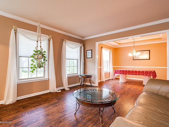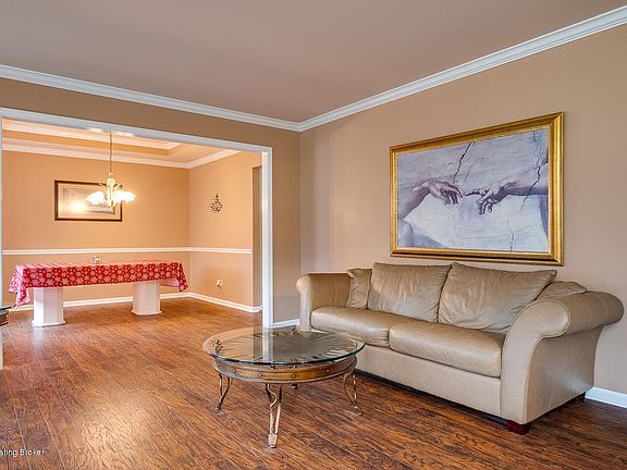 Incredible location! This Crestwood home is central to all of your Oldham and Jefferson County needs. Easy to maintain landscape provides great curb appeal which lends to the charm of this home. Many of the shrubs surrounding the home are evergreen, giving this home a fresh look throughout each season. Three beautiful windows allow you to bring the outdoors in and provide an abundance of beautiful, natural light. The wide dining room entryway creates a large sense of space from room to room and allows you to look in on the formal dining. Beautiful seamless flooring flows from room to room throughout. Decorative chair rail and a tray ceiling formalize the dining space which looks into the kitchen and the living room. In the kitchen is a beautiful well lit breakfast (continued)