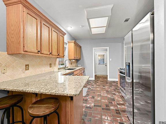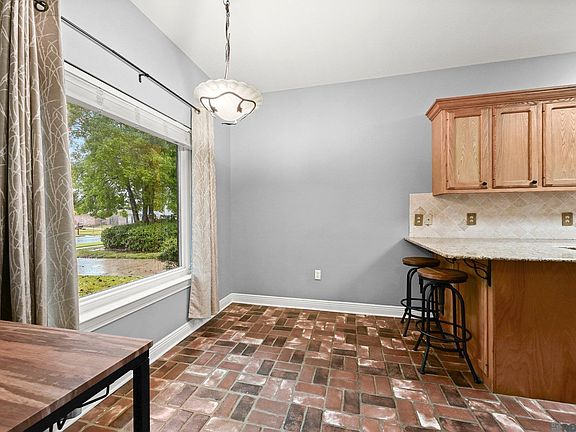 Welcome home to this 3 bedroom, 2 bath home located in Woodlawn Estates Subdivision. Conveniently located near shopping, restaurants and schools. The kitchen features brick floors, granite countertops, marble backsplash, under-mount sink, separate pantry, a gas cooktop, and a breakfast area. The large living room which opens into the dining room has a cozy fireplace surrounded by built-ins, crown molding, and tile flooring. The primary bedroom is very spacious, has two walk-in closets and a mounted TV which will remain. The primary bathroom has a newly refinished stand up shower and a large, jetted soaking tub. When it’s time to relax you can enjoy time on the back covered patio which overlooks the large, fully fenced yard. It’s a great entertaining space that includes a mounted TV and patio furniture which will remain with the home. There is NO CARPET in the home. Recent home improvements include a new HVAC system, new water heater, new flooring, a security system and an electric iron driveway gate that adds both security and convenience. The microwave and refrigerator are negotiable. This home has never flooded and is currently located in flood zone X where flood insurance is NOT required. Schedule your private tour today.
