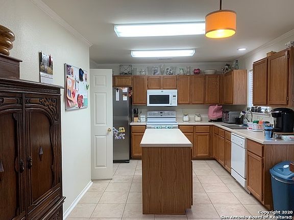 This beautiful two story home offers 3 bedroom, 3 living rooms, 2 eating areas, 2.5 baths, two car garage, good size pantry/laundry room, island kitchen, walk in closets throughout, wood burning fireplace in family room, tile flooring first floor and baths upstairs, composite deck, Tuff Shed, privacy fence, mature trees with room to play. Neighborhood offers electric gate, pool, park and playground. located near shopping, bus, RAFB and Fort Sam.