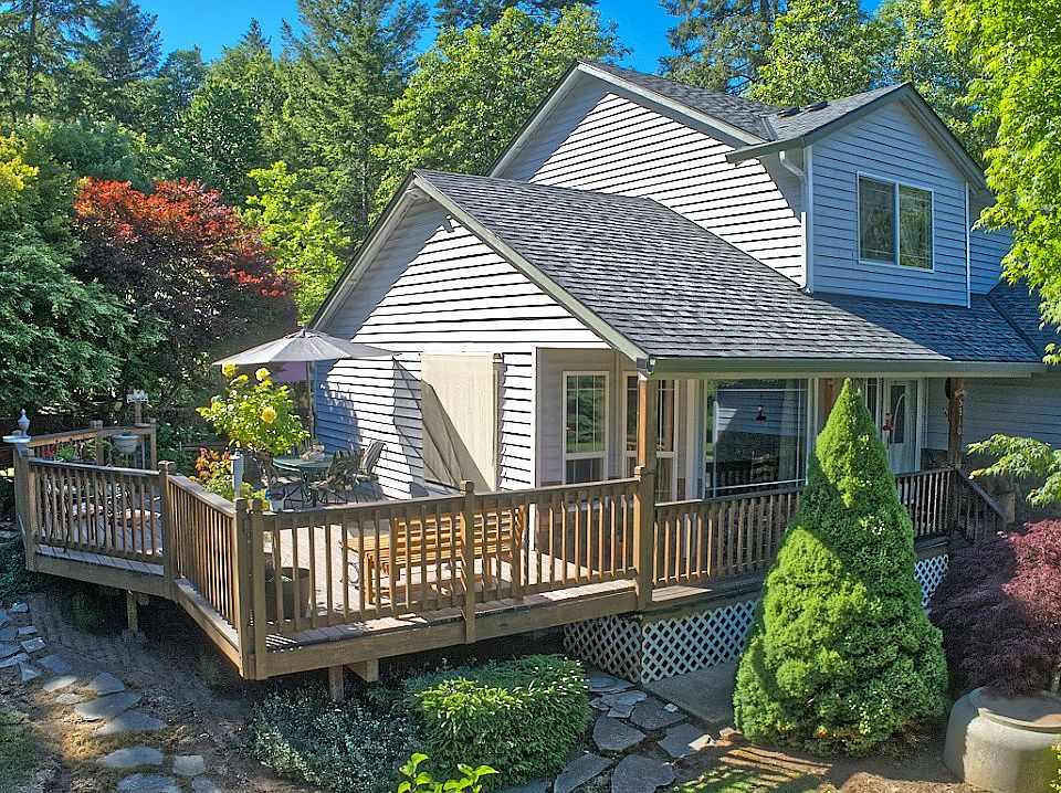 This home is set on over 3 private park-like usable acres in a tranquil setting!Lush landscaping,fenced pasture,fruit trees,flowering plants & garden. Shed, shop w/wood stove; both with power. Relax on the front porch, wrap around deck or covered patio! Recent upgrades include an updated kitchen,slab granite,SS appliances, int.paint, carpet & new 50 year roof! 1 bed on main level,3 beds up. Beautiful views from everywhere! RV parking