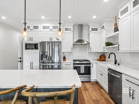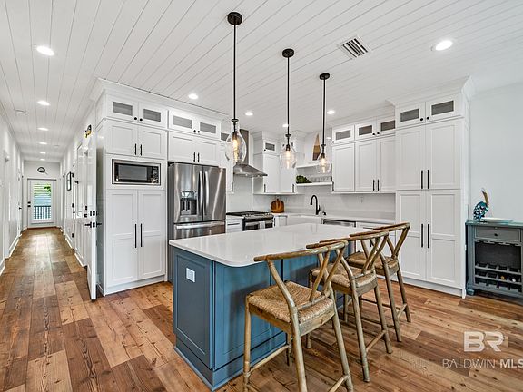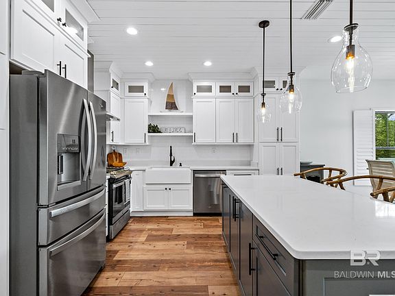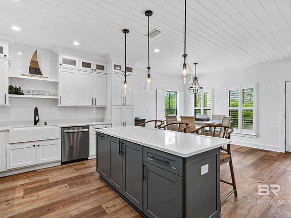 Beautifully crafted 2021 home in the highly sought-after East Orange Beach community! Perfectly situated less than one-tenth of a mile from Bay La Launch with indirect water views, the Fortified Gold house rests on a 50’x140’ lot creating a spacious backyard and covered entertainment area under the home. As you enter the house on the ground floor, you are welcomed by 10.5-foot ceilings, a large gathering space that doubles as a bedroom, and a full bathroom. After making your way up the elegant real wood stairs, you are greeted by 9-foot tongue and groove wood ceilings, crown molding, and an open kitchen that effortlessly flows into the dining and living areas. The kitchen is equipped with custom ceiling-height soft close cabinets and drawers, quartz countertops, an island with seating for three, pendant lighting, stainless-steel Whirlpool appliances, a GE 5 burner gas range, and a tiled backsplash. The master suite features his and her vanities, quartz countertops, a spacious tiled walk-in shower, a large walk-in custom closet, and recessed lighting. The over-sized front and rear porches are outfitted with tongue and groove wood ceilings and seamlessly connect the interior and the exterior of the home creating ideal entertainment spaces. The home also boasts plantation shutters on all second-floor windows, luxury vinyl plank floors, a large laundry room, tiled tub surrounds, impact glass windows, a metal roof, outdoor lighting, outdoor shower, and an over-sized driveway allowing for multiple vehicles, boats, and RVs (10.5-foot height clearance under the house). Residents of the East Orange Beach community enjoy easy access to the Orange Beach Elementary, the Orange Beach Recreation Center, and several private beach areas and boat launches (must be a member of the voluntary HOA at a cost of $300 per year for access to the neighborhood amenities - no formal HOA). Seller holds a Real Estate License in AL. Buyer to verify all information during due diligence.