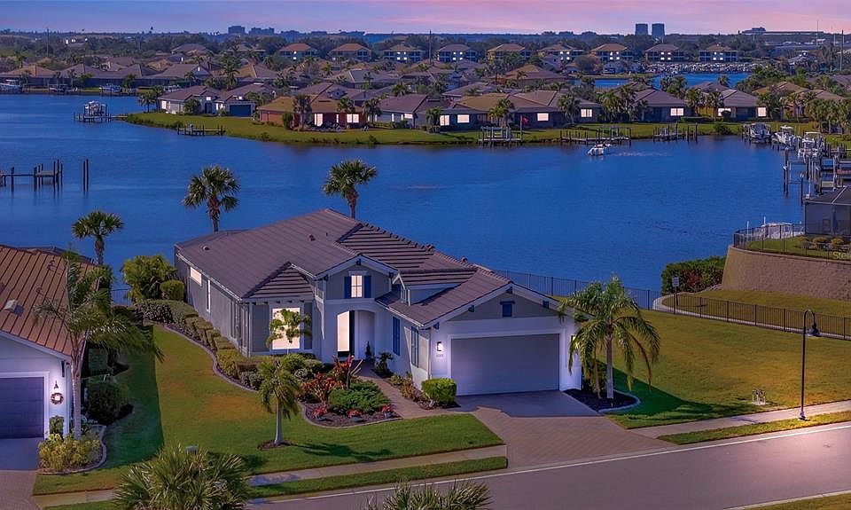 Life On the Water's Edge! Nestled between sundrenched waters of the Manatee River & shimmering waters of the 55 acre lagoon. This Coastal Inspired home offers an open floor plan that filters in an abundance of natural light "Water, Water Everywhere," custom-designed, meticulously maintained waterfront home that exudes the WOW factor from the moment you step inside. The shimmering light on the water immediately captivates you as you gaze out to the expansive Lagoon, set atop the highest point in the community. Located in an X Flood Zone, this property is high and dry with no flood risk. This open and bright home features 3 bedrooms, 2 baths, plus a den, seamlessly blending indoor and outdoor living. Step outside to your private dock and for a day of exploring the Intracoastal waterways, visiting private islands, fishing, or cruising to local waterfront restaurants. Back home, shower off at your outside shower or relax with a refreshing dip in the saltwater heated pool/spa, or cook up the day's catch in your outdoor kitchen while watching the stunning sunset. This is waterfront living at its finest! This home is designed with energy efficiency in mind, featuring a tankless hot water heater, Isolcene insulation in the attic, and additional insulation in the walls and ceilings for optimal comfort and savings. 2022 High Performance Energy Efficient Heat pump HVAC with top SEER and Dual Circulation. Impact windows and doors, along with 2 Kevlar hurricane screens, provide peace of mind during storm season. A whole-house generator ensures you're always powered up, and a water softener adds convenience and comfort. For those who enjoy working in the garage, you'll appreciate the air-conditioned space with a mini-split system and extra storage, providing a comfortable and organized workspace year-round. This home combines luxury with practical, energy-saving features to enhance your lifestyle. If you love to cook, you'll be inspired by this stunning kitchen, featuring sleek quartz low bar counters and top-of-the-line Bosch appliances new 2023, including a 5-burner gas stove, refrigerator, and dishwasher. Accent under counter lighting, Custom white wood cabinetry with pull outs adds to your convenience and adjoining pantry.- The home is beautifully tiled throughout, with upgraded bathrooms offering modern finishes. For added convenience and comfort, the home includes an automatic sunshade, alarm system, and Ring doorbell for peace of mind. Positioned to take full advantage of natural beauty, this home offers sunrises in the front and breathtaking sunsets in the back. With no neighbors to the east, it provides a unique and private setting, making it a truly exceptional property. Resort Style living, Maintenance Free, Gated & Secured Tidewater Preserve offers full time lifestyle director, 3 Har-tru tennis courts, River Lodge w/fitness center, community room & resort style pool plus 2 additional community pools. Private Marina as well. Walk along Manatee River on nature trails, dog park and children's playground. Tidewater has an abundance of social activities, Low HOA fees NO CDD fees. Located minutes to I-75 & major airports, World class shopping, restaurants & beaches. This boating community is the Perfect Place to Live & Play! Come Live on the Water's Edge!