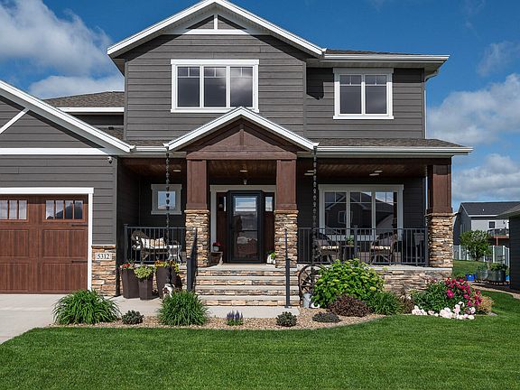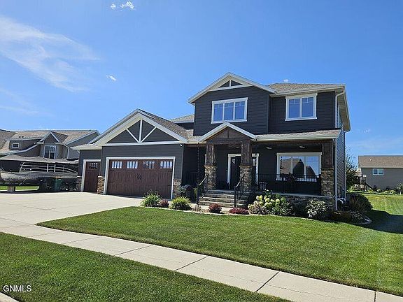 This impressive 2-story home in Bismarck's sought-after Boulder Ridge neighborhood offers the perfect blend of style, comfort, and functionality. Impeccably maintained, this home nurtures everyday living & effortless entertaining. From amazing curb appeal to an exquisite interior, you'll discover a thoughtfully planned home that unites an open floor plan with gorgeous wood flooring, stunning CAMBRIA QUARTZ counters combined with custom tile work and beautiful CUSTOM MAPLE CABINETRY with soft-close features, all adding a touch of luxury. This home will impress with its unique elegant NATURAL STONE ACCENTS, plantation shutters, barnwood accents, tons of built-ins, and more. The main floor opens with a front office accented by French doors; a guest A½ bath, coat closet, and a delightful mudroom with a handy custom BUILT-IN BENCH & coat hooks, plus cabinets and a coat closet - leading to the 5-car finished & heated garage. An incredible living room is offset by a graceful NATURAL STONE archway, a cozy gas fireplace surrounded by impressive stone facade and custom built-ins. The dining area offers access to a MAINTENANCE-FREE COVERED DECK with a retractable sunshade plus a sound system, lighting and views of a wonderful, manicured yard. Next up is your dream-come-true gourmet kitchen! With ample CAMBRIA QUARTZ counters, maple cabinets with SOFT-CLOSE, stylish tile backsplash, a custom range hood over a gas cooktop, double-oven, center island with contrasting finishes, and massive walk-in PANTRY this kitchen has it all. Upstairs is a full guest bath; 3 large guest bedrooms with plenty of natural daylight; and a luxurious PRIMARY SUITE. The primary features are a race-track ceiling, numerous windows for added natural light, and a barn door opening to a fantastic spa-like PRIVATE bath, perfect for pampering yourself. The primary bath boasts lovely dual-sink vanity, custom tiled SOAKER TUB, custom tiled shower with rain head, and linen closet, opening into an enormous WALK-IN CLOSET with custom built shelving (don't miss the hidden storage room where you can store all those extra items). A conveniently placed laundry room with sink, folding counter and cabinets is just off the primary bedroom. Wrapping up this level is a cozy family room. The finished basement is designed for entertainment, featuring a huge family room hosts a striking gas fireplace with stone surround, custom BARNWOOD finishes on the walls, a wet bar with beverage fridge, and a theater system. Just off the family room is a WALK-IN SAFE where you can securely store your valuables with peace of mind. Continuing, you'll find another spacious guest bedroom with walk-in closet; a full guest bath; and impressive STORAGE. The fully FINISHED 5-car heated garage has plenty of room for all your vehicles, or other equipment, and offers a parking pad. The meticulously manicured yard features various perennials, bushes, trees and is professionally landscaped with a stamped concrete edging. The STAMPED AND STAINED PATIO encourages a playful tone with its unique hopscotch, tic-tac-toe, and chess board patterns engraved. With all these amazing features coupled with a great NW location, you'll want to make this your new home. Don't Miss It! Contact a REALTOR® today to make it happen!