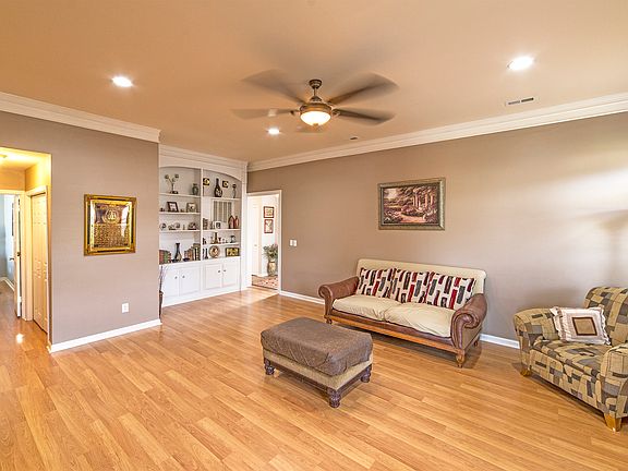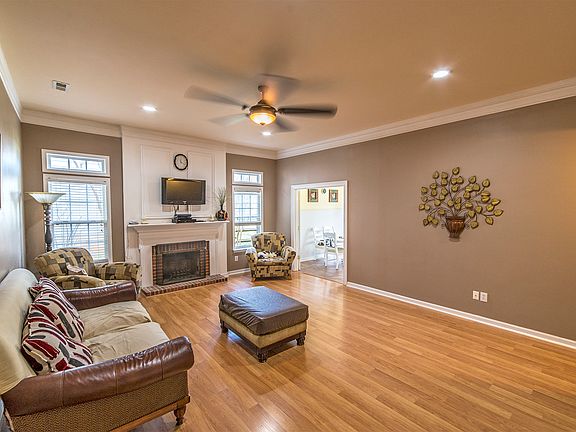 Well maintained ranch 9' ceilings in great rm, crown molding, wood burning fireplace, built in shelving, french panel doors to dining rm, glass upper cabinets in kitchen, island pendant lights, great view and privacy in wooded fenced yard. Private Master bedroom w/trey ceiling, walk in closet, Mstr bath sep tub & shower, dual sinks, Secondary bedrooms good size w/ample closet space. Cute patio and storage/outbuilding. What a great house, come make this one yours today. Neutral colors throughout!