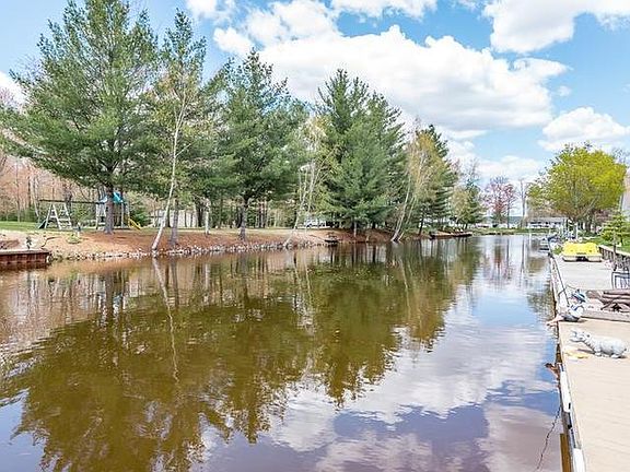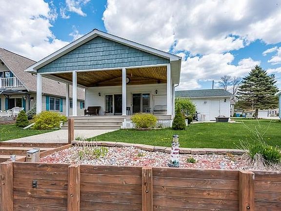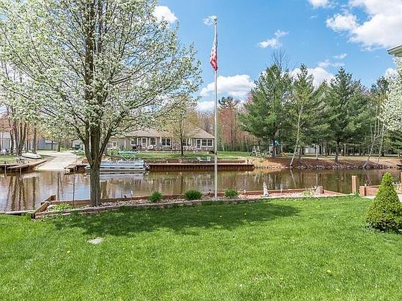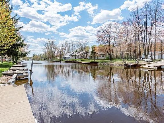 Two story traditional home with 60' on an all sports Wixom Lake canal. Located on a paved street with a quick commute to US10 you can live here year round and enjoy lake life! Step inside the 3 bedroom, 2 bath, 1,300 sq ft home and the sliders to the extra large, covered, composite deck and view of the canal grab your attention. Pergo flooring in the main living area with granite counters in the kitchen with tile back-splash and recessed lighting. Gas fireplace in the living room for relaxing evenings. Main floor bedroom with a full bath across the hall with laundry. 2 additional bedrooms upstairs with another full bath. Level yard, large boardwalk with steel seawall makes getting on and off the boat easy for everyone! 2 car attached, heated garage, sprinkler system, cement patio, storage shed, concrete drive and nice landscaping complete the package.