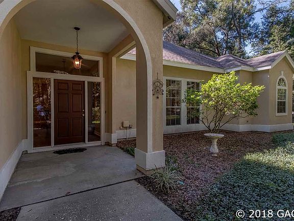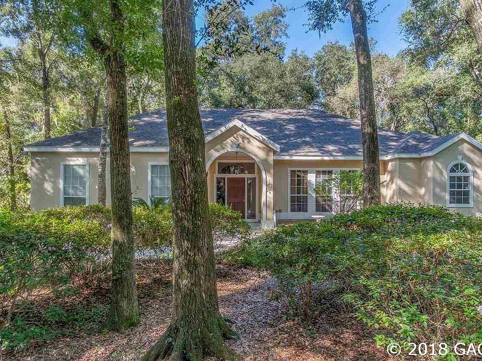 If you have been wanting to move to the ambiance of Haile Plantation and enjoy the amenities offered by the neighborhoods and Village Center, you must visit this home. The current owners have completely renovated this 4/2, 2702 sq ft home, including beautiful Brazilian Cherry engineered flooring in all family living areas, a new washing machine (2014), refrigerator (2017), new roof & exterior repainted (2018), gas tankless HW heater (2018), new garage door & opener (2018) and new carpeting for all other rooms (2018). The entire kitchen was upgraded with granite countertops and SS appliances. Ceilings are all either vaulted or coffered, making your space feel exceptionally large. The lanai was converted to a Florida Room with sliding windows, allowing you extra living space, looking out on your privacy-fenced backyard that backs up to common area beyond the fence. The master bedroom has an attached sitting room that could also serve as an office. Sentricom contract in place and is transferrable to the new owner. Front yard is nicely landscaped with shrubbery making it nearly maintenance free. A home very much worth viewing!