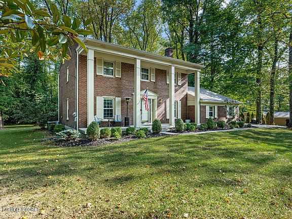 A true classic in the Buckner area, add this home to your showing line-up this weekend! 5313 Barkwood Drive is a traditional brick 2-story with tons of space, a shady lot and the perfect Buckner area location. From the moment you turn onto Barkwood Drive, you are in a Hallmark movie. With the leaves falling and the quiet of this spacious corner of town, you will feel right at home. The home features gorgeous two-story columns, shutters and an all-brick exterior. The front door opens to a roomy foyer and staircase that will waken nostalgia. The main level has ample living space with formal dining and living rooms that connect to the kitchen and family room in a big loop. Large sliding glass doors behind the eat-in area offer a stunning view of the flat and woodsy backyard. Flooring throughout has been replaced with a laminate wood. To the right of the kitchen there is a half bath, and laundry room which has access to the back patio. The oversized garage is also to the right of the home and has a HUGE workshop area with closet storage and bench. Upstairs, there are 4 bedrooms, all with excellent views of the falling leaves in 'The Woods'. The primary bedroom has lots of space and secondary bedrooms are larger than the average as well. Primary bedroom has an ensuite full bath. Basement is finished with fresh epoxy floors and paint - as well as a built-in bar. This 0.84 acre lot is flat and private. There is even a propane hookup for a grill in the back patio. See our 'Upgrades & Improvements' sheet attached to the listing for a full list of upgrades. Water Heater is new as of 6 months ago and septic has been recently pumped and cleaned. This home is all right turns to Oldham County Schools in the Buckner area, which makes for a simple commute. Enjoy being close to town, from one of the most private streets in the area.