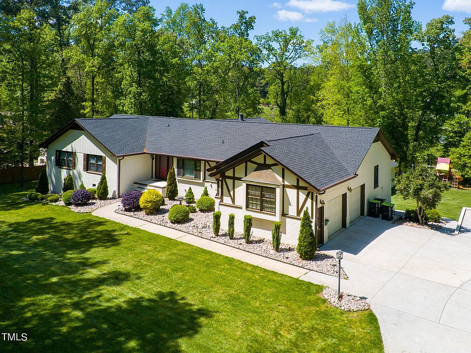 SHOWINGS START 4/3/25! Enjoy one floor living in 3 BR / 4 BA home on 1.36 acres in Raleigh's best kept secret neighborhood of Foxcroft. Although the home has a septic permit for 3 bedrooms it was being used as a 4 bedroom home. In this nicely updated home you'll find a large great room with plenty of natural light. The open kitchen design has three oven spaces for those who enjoy cooking (two in the range and one more in the brand new built-in oven/MW). The flex room with full bathroom is separate from the three bedrooms so it would make a great suite for in-laws, college student or nanny...and it can be accessed without coming into the main area of the home. This house is all main floor living but is complimented by a walk-out finished basement that includes a living area, bar, an office/flex room, full bathroom, and a large workout studio with so many possibilities. You'll love the community with large lots, mature trees yet so close to Rt 1, 540, 440 and downtown. Enjoy the outdoors on the large deck with nature views, a playground and a basketball court. The large detached workshop has great potential for the woodworker or hobbyist in the family. Houses in this neighborhood don't last long so come and see it before it's gone! No HOA and no city taxes! Neighborhood has direct access to the Raleigh Greenway for exercise. Brand new Publix shopping plaza is being built on the corner of Buffaloe Rd and 540 for added convenience.