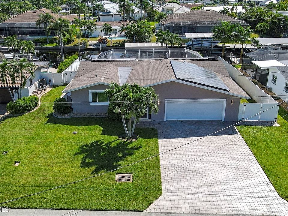 YACHT CLUB DIRECT ACCESS POOL HOME!! If you’re looking for a waterfront life without the headache, this is it. Completely renovated 2,106 sq ft home in 2019, creating a perfectly comfortable layout with three bedrooms and three full baths, including two beautiful en-suites. Boat life is effortless here. You have DIRECT Gulf access with no bridges—it’s just a few minutes from your dock to the Caloosahatchee River. The 10,000-lb boat lift is a dream, featuring a new dock and a fresh canopy to protect your vessel. Spend your days soaking up the sun by the heated, salt-system pool. Or, if you need a little project space, the oversized two-car garage is climate-controlled with its own mini-split A/C. Best of all, this home is truly worry-free. You get impact windows and doors, a whole-house automatic generator, and a fully paid-for solar system that keeps the electric bill at an unbelievable $30 per month. Located on a quiet cul-de-sac, you can easily skip the bridge traffic and head straight to all the fun downtown Cape Coral restaurants. Assumable flood policy only $2945, seller has had no claims in any of the recent storms. Don't miss your chance to make this house your forever home in paradise! Schedule your showing today!