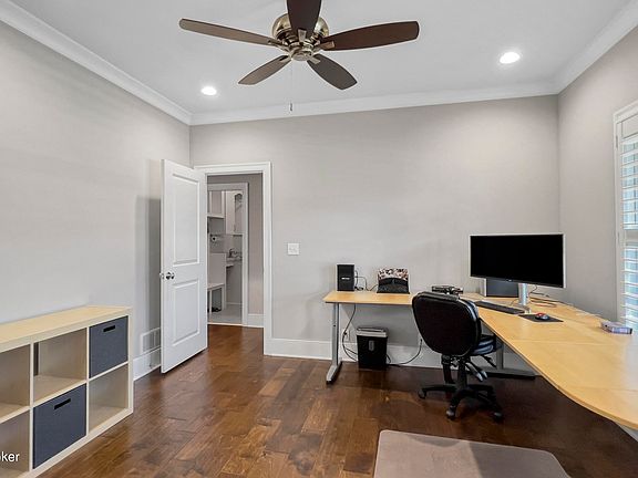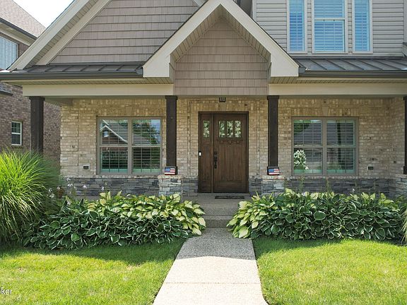 Fabulous 5BR, 3.5 Bath 1.5 Story features front and rear porches, open floor plan and 1st floor Primary Suite! A vaulted foyer with hardwood floors opens to a 1st floor office, dining room and a vaulted Great Room! The Great Room features hardwood floors, fireplace flanked with bookcases, rear wall of windows and opens to a gourmet style kitchen! The Kitchen features white cabinets, granite countertops with tile backsplash, upgraded stainless steel appliances & hood and breakfast area with windows and doors leading to a covered porch and expanded patio space! Hardwood floors extend into the 1st floor Primary Suite featuring tray and circular domed ceiling, rear wall of windows, 2 walk-in closets and a ''spa'' inspired bath featuring floating tub, double vanities and a large tiled and glass enclosed shower! An open staircase leads to 3 large bedrooms with hardwood floors and a tiled full bath, one BR features a vaulted ceiling. The finished lower level includes; laminate flooring, tall ceiling height and recessed lighting, a family room, recreation and game space, an office, 5th BR with egress window and a 3rd full bath! Large 2 car garage, professionally landscaped rear yard with tree line for privacy, irrigation front and rear yard! Rock Springs offers a small playground and is convenient to I-265 and The Paddock Shoppes!