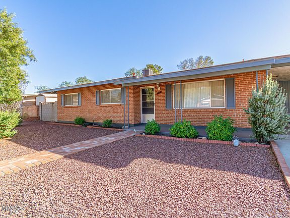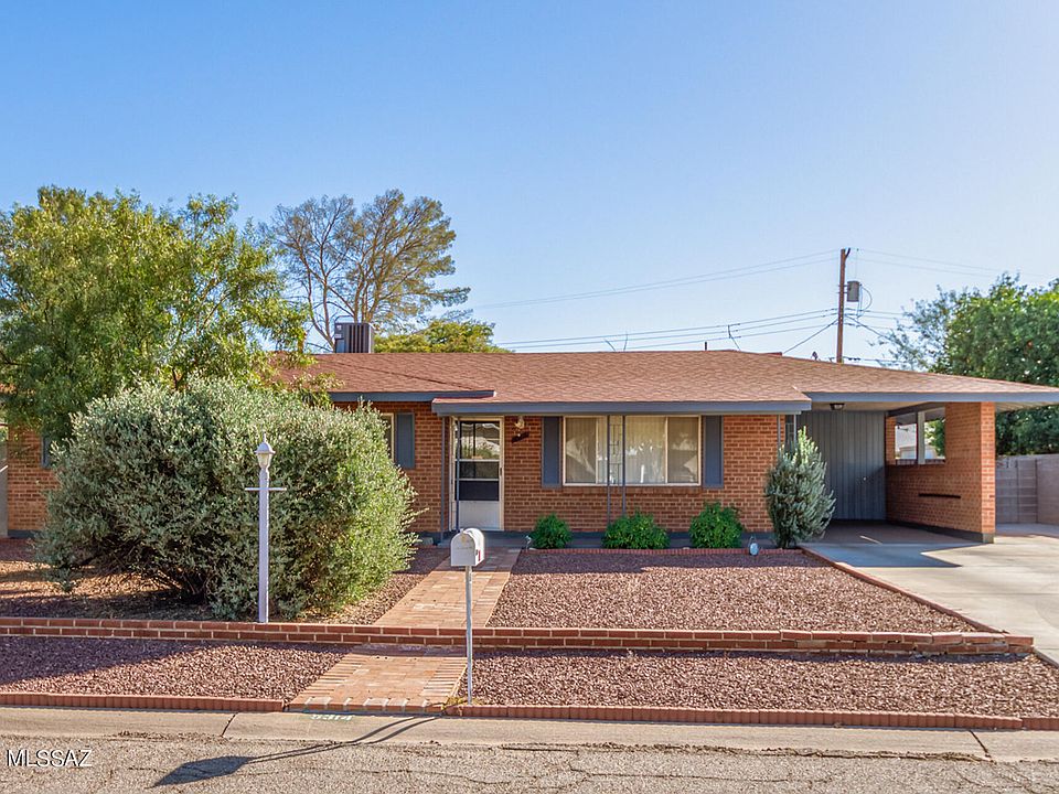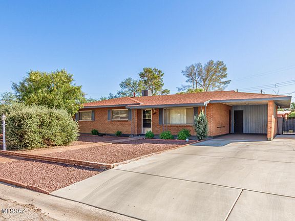 Great Curb Appeal with this newly updated red brick single-level ranch style home on a quiet cul-de-sac. Low maintenance desert landscape, a cozy front porch, a carport, & lots of space for additional parking on the concrete driveway. New roof, AC and Water Heater in 2023! Step inside to a welcoming living room, new paint interior & exterior, laminate wood look flooring, and mid-century modern design features. The kitchen showcases built-in appliances, granite counters, & plenty of cabinetry. Main bedroom is a retreat, providing a convenient private bathroom. New carpet in all the bedrooms (2023). The expansive Arizona Room offers the ideal setting for year-round entertainment. The over-sized backyard has a covered patio perfect for relaxation. Great central location, close to shopping, entertainment, schools, hospitals, & more.
