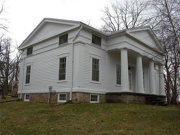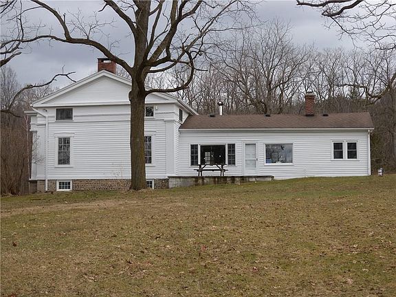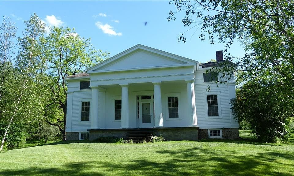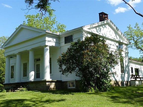 In his classic 1936 book "Listen for a Lonesome Drum" noted author Carl Carmer described this home as "the one house of beauty and dignity in the region"; This home and property have been lovingly maintained by the current owners since 1962; While the magnificent front columns and painted clapboard siding retain their classic charm, the geothermal heating & hot water system & totally upgraded mechanicals provide modern dependability; outside TV antenna gets Rochester & Buffalo; the 100 wooded acres are gently sloping with two miles of mowed trails throughout the property; the woods have not been logged during their ownership; two ponds; 1964 24'x36' garage