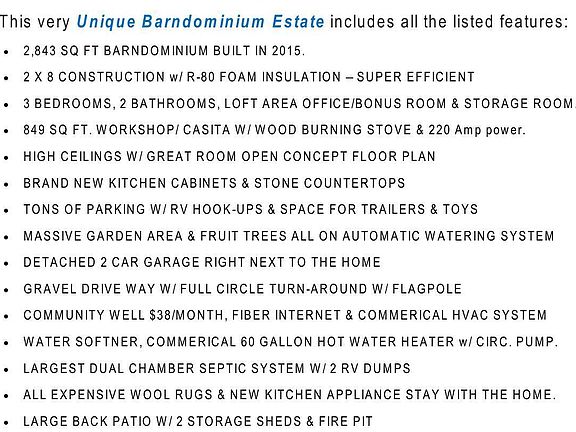 This MINI RANCH BARNDOMINIUM Estate is what people only dream about. This eXtremely unique Home is exploding with CHARACTER & CHARM. Complete with a cozy front porch swing and views for miles. The OPEN CONCEPT, SPLIT FLOOR PLAN, & VAULTED Ceilings provides the perfect gathering place. The Large Kitchen area boasts w/ NEW CABINETS, STONE COUNTERTOPS, NEW APPLIANCES, and MASSIVE PENINSULA with space baking, entertaining or gaming. The HUGE Primary Owner suite comes w/ 2 large walk-in closet, double STEAM SHOWER, & dual vanity w/ 2 sinks. The Loft is a bonus area for an office or den. Loads of storage space under the loft, lots of closets, 2 Car Garage, and sheds. The 846 Sq Ft. GUEST QUARTER is being used as a woodshop now and has a wood burning stove. Current Owner built this 2x8 Home with foam insulation w/ a R80 efficiency rating, commercial HVAC system, fiber optic cable/ethernet outlets, all LED Bulbs, so everything is super efficient energy wise. All expensive wool rugs convey. The .68 Acre LOT comes with 2 RV Hook-up areas, Well Water at $38/M, Largest Dual Chamber Septic System, Massive Garden area, fruit trees, fit pit area or space for animals, toys, and more. YOU WON'T FIND ANOTHER HOME LIKE THIS.