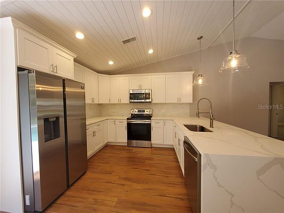 Hurry in to see this tastefully remodeled split floor plan style home with a POOL. This 3 Bedroom / 2 Bath has an open, bright floor plan with ample natural lighting. You will love the spacious living room with vaulted ceiling and new vinyl wood like floors throughout. This home has brand new paint inside and out with modern yet classic fixtures. Each of the bedrooms have new carpet that gives you a warm feeling. Any chef will adore this designer kitchen featuring Calcutta quartz counter tops, new white shaker cabinets, all new stainless steel appliances and a decorative marble tile backsplash. The kitchen/dining room overlooks the pool deck and open air pool with a large backyard surrounded by privacy fencing. The master suite has a large walk in closet and ensuite bath. Both bathrooms have been newly updated with Calcutta marble looking tile. You will enjoy true Florida living on the screened lanai overlooking the private back yard. There is also an inside laundry room and a oversized one car garage. New AC system. Home Priced to Sell. At this affordable price, it will not last long.