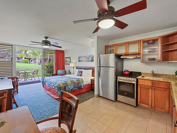 Ground-floor studioClassic lava-rock designConsistent natural lightDirect beach accessWood cabinetryDesirable lanai settingSouthern exposure