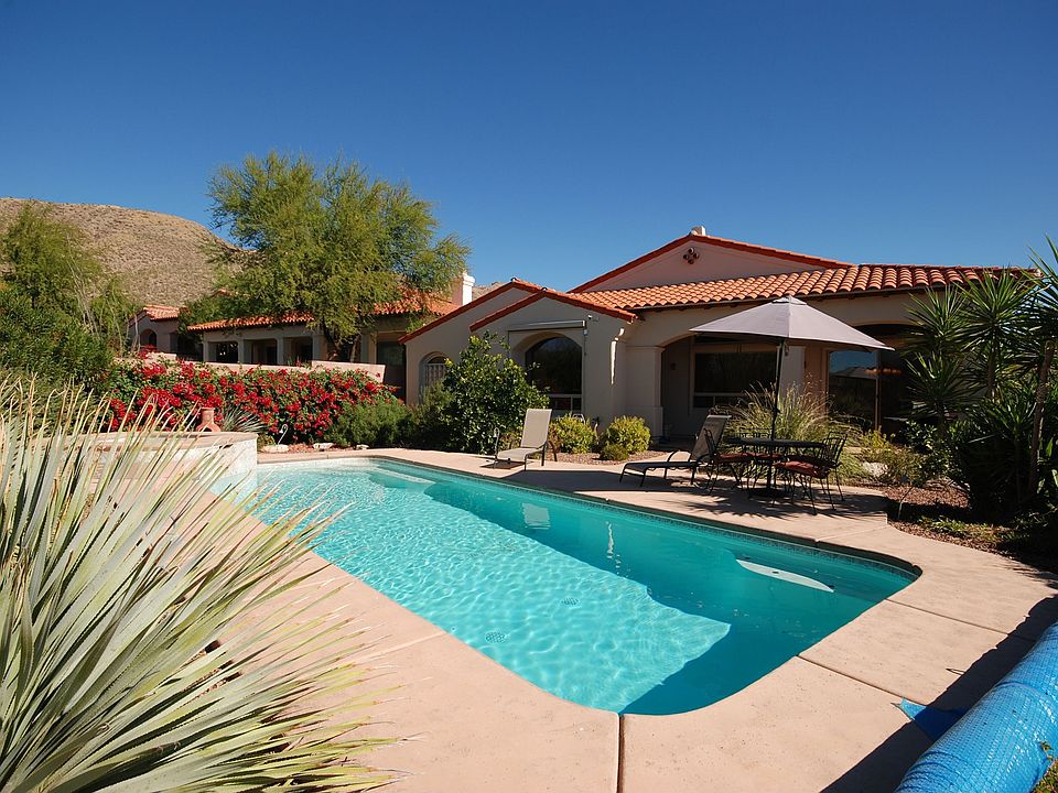 Prestigious gated AZ Natl Golf Course home shows like a model! Located on the 15th fairway, views of mount & city lights abound. Features incl: high ceilings,arched doorways,niches, kitchen w/slab granite counters,SubZero frig, GE Profile Appls, Island w/sink & skylights. Separate bar w/wine cooler adds to entertaining. Den boasts built-in cherry desk & Murphy bed. Relax in sparkling pool & spa! Electric solar powered window screens on patio.