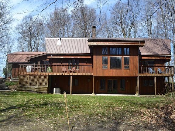 Post and beam cedar home way off the road on over 48 acres. Horse barn, pastures, wooded trails and pretty spring fed pond! Home has vaulted tongue and groove cedar ceilings, master suite with hot tub, soaring two story stone chimney, oak kitchen, walls of glass overlooking peaceful setting. Screen porch & multiple decks. A two car attached garage plus a 4 bay garage- workshop with heat, water and electric. This unique country property is only minutes to Ithaca. Life is not a dress rehearsal.. time to live your dream. a fantastic value.