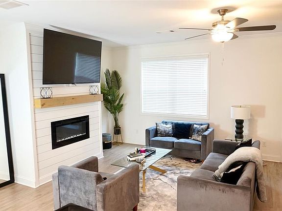 Welcome to your new home, ideally situated near historic downtown Flowery Branch with easy access to Lake Lanier, I-985, and all the shopping and dining at Stonebridge Village. This vibrant community features a pavilion, fire pit, and plenty of green space for relaxing and gathering. The kitchen, designed as the heart of the home, boasts white cabinetry, stainless steel appliances, granite countertops, and a spacious island with a farmhouse sink overlooking the Great Room. A cozy electric fireplace with shiplap accents and a stained mantel adds warmth and charm. Step outside to a covered back porch that extends your living space outdoors. Upstairs, the primary suite offers a trey ceiling, walk-in closet, and a beautifully tiled ensuite with a double vanity, garden tub, and separate shower. The laundry room is conveniently located nearby. Two additional bedrooms share a stylish Jack-and-Jill bathroom. This smart townhome is equipped with a Luxul system, upgraded wiring, and a Ring doorbell, combining modern convenience with timeless comfort.