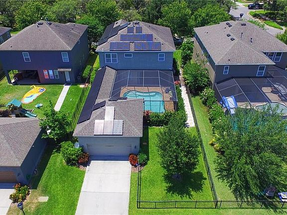 SOLAR POWERED HOME. The Future is Now. Come see this ONE OF A KIND Ashton Woods POOL Home located in the popular Starling Section of Fishhawk Ranch! Guest parking out front and just steps from the Starling Clubhouse offering a resort style community pool, splash pad, outdoor playground, dog park, fitness center, pool tables, air hockey, and board games and More! This home is loaded with upgrades and special features. A Wonderfully designed plan featuring 4 Bedrooms, 2 ½ Baths, Upstairs Loft AND A first floor Study/Home Office. You are greeted by a handsome elevation and brick paved Walkway and Front Porch. Step inside and immediately notice the wood laminate flooring and light/bright colors. Dressed in granite counters, the Gourmet kitchen is equipped with a new upgraded microwave and stove, Mosaic backsplash, plenty of counter space, center island and walk in pantry. The Kitchen opens to a spacious family room with tons of natural light offering pool and backyard views. Venture upstairs to discover 4 bedrooms and a loft. Step outside and you'll notice the covered/screened lanai, brick paver pool deck, you will also appreciate the covered breezeway from the rear entry garage and Fenced Yard Space! This home is loaded with energy efficient features that keep operation costs to a Minimum. An upgraded a/c system provides clean and healthy living, reclaimed water for outside irrigation, solar heated/salt pool, attic fan AND this home is run on solar power. Unbelievably inexpensive utility bills! See the attached list of upgrades and improvements. The New Home Owners will Enjoy Resort Style Amenities, Top Rated Schools, Minutes to Tampa, Bus service available to MacDill AFB and an easy drive to World Class Beaches!