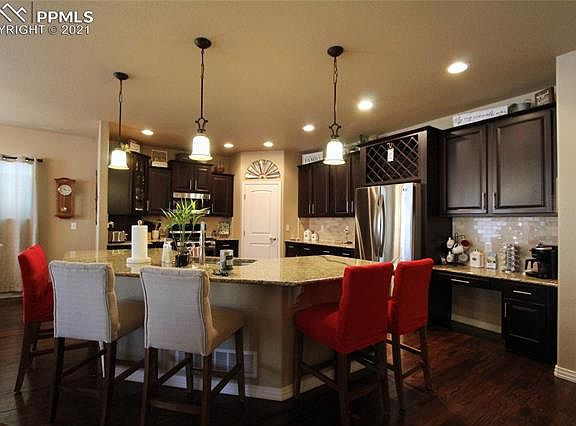 You're done looking for the perfect home. This is IT! Fits any family dynamic with 5 bedrooms, 3 baths, and an oversized 2 car garage (24'X19') with workshop (11'X6' with window)! The open concept of this custom-built rancher is so inviting and begs for a party, family dinners, and movie nights! The kitchen is located in the center of the mix (we all know that everyone ends up in the kitchen anyway) with the family room (with cozy gas fireplace) and dining room seamlessly adjoining. Granite countertops, hardwood floors, upgraded stainless steel appliances, and beautiful lighting grace the kitchen. With a large pantry, generous cabinets and tons of counterspace, you have plenty of room for preparing and serving meals, doing homework or just having a snack. The master bedroom is spacious and bright, with a sitting area and plenty of natural light from the many windows. The ensuite bath has a double vanity and a luxurious shower with double shower heads and custom tile, separate water closet, linen closet and walk-in clothes closet. A secondary bedroom, full bath and laundry room (with utility sink) round out the main level. Need room to really spread out? The finished basement is your free time, watch a movie, play a game, work-out, entertain some friends, store your stuff PLACE! 3 additional bedrooms and a 3/4 bath make this home great for the whole family...Teenagers? Out-of-town guests? In-laws? The theater/family room/game room has an added entertainment center with electric fireplace and a granite topped sideboard. The wet bar boasts a gleaming wooden bar with a "kitchen" filled with a dishwasher, bar sink, and beverage fridge. You'll put your own unique decorating spin on it, we're sure! The finished under stair play area will delight your littles. Storage areas for all your extras too. Walk-out to the back yard and see all the entertaining/living/play areas!10'X8' paver seating area with a peek of the Peak, lawn, & huge patio. Just come see it!