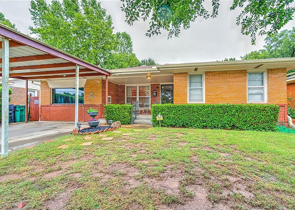 This home in OKC is just so adorable and awaiting its new owners! With a convenient location and easy access to major highways, restaurants, and shopping centers all nearby. Great curb appeal with a nice front porch and large covered parking. Step inside and be welcomed by the spacious floor plan with the converted garage. The flooring is all laminate wood or tile for easy living and the home has tons of additional storage. As you pass the dining room you enter the kitchen. Kitchen showcases painted cabinets, and tiled backsplash. If you can't stand the heat in the kitchen, this one has a ceiling fan! From the kitchen make your way past the indoor laundry room into the huge 3rd bedroom, this room could be used as an additional living area. On the opposite side of the house you will find the master bedroom with several windows allowing for natural light to enter the room. The covered back patio overlooks the lovely spacious backyard and storage shed. This home is a must see!