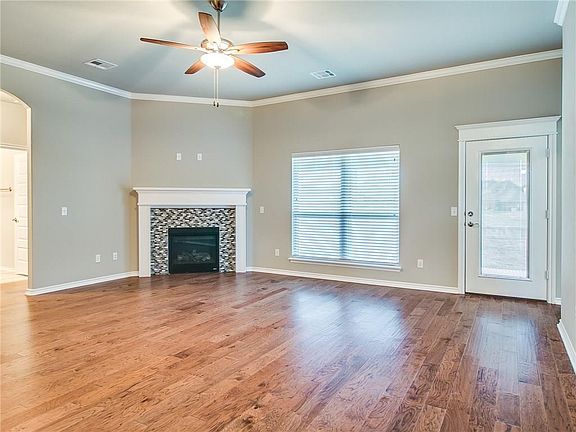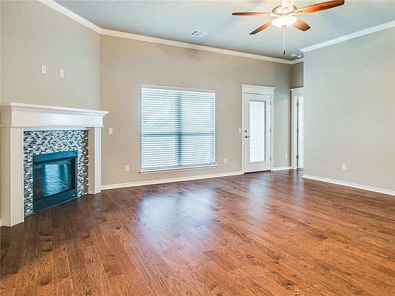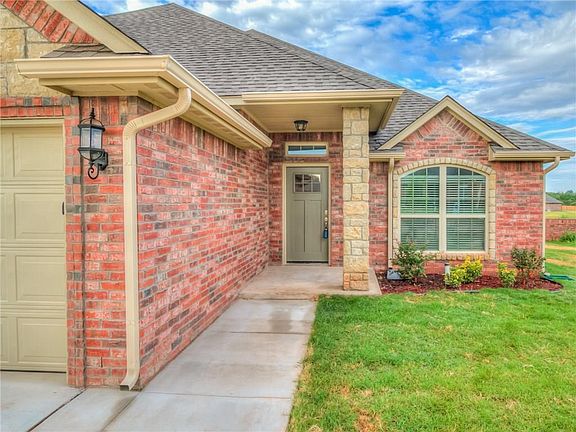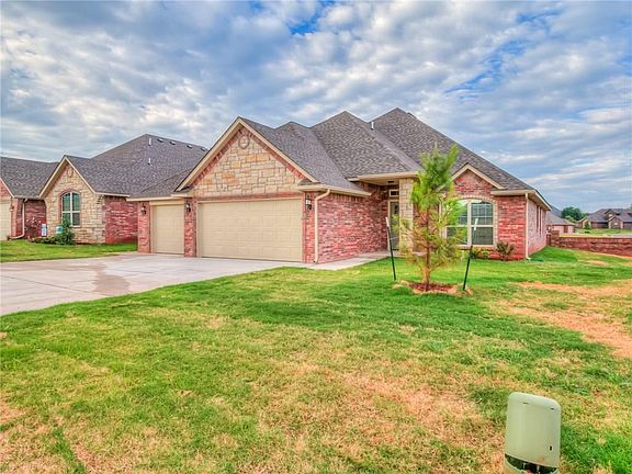 This home is located in a beautiful gated addition. If you’re Looking for a home with yard work taken care of by HOA. Here it is! Included with yard maintenance is exterior paint, community pool and clubhouse. Carefree living at its best. Open floor plan, large living with gas log fireplace, wood floors and customary ceiling fan. Kitchen has built-in SS range and built in oven and features a huge granite island as well as granite counter tops. Kitchen also features a Coffee bar or can be used for small appliances. The island has seating for 6. Also a granite bar With additional seating. Lots of cabinet storage and a pantry. 2nd living/dining/study, use your imagination. Beautiful rectangular tile in the kitchen and In both baths. . Owners suite has a sitting room that can serve many functions (home office, workout room, private living area/TV-media room. Guest bedrooms are very large and away from the owners suite.Yard is fenced and has a view of one of the addition lakes. Three car garage, with a built in tornado shelter.