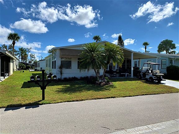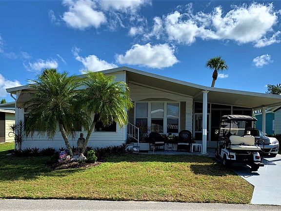 You are one decision away from changing your life and enjoying the Florida sunshine in the gated community of Camelot Lakes. This is a 2 bedroom/2 bath home in the 55+ community where you have over 252 days of sunshine or more. This home is turnkey, meaning all furniture remains except the wall art, or come with your own (your choice). There is room in the carport for two cars and a golf cart which is negotiable. The front entrance also has an intimate, under cover seating area. The outdoor screened-in room off the carport is a respite you will enjoy with room for grilling, enjoying a meal and relaxing. There is also a door that leads to a very inviting back patio with an umbrella for shade or enjoy the fresh air and sun. This area is hidden by the mature foliage and a border of shrubs. Behind the screen room is a utility building where the washer/dryer reside along with storage shelves for all your bikes, golf clubs, and beach gear. The second entrance enters into the galley kitchen with crisp white appliances and cabinets, laminate countertops, glass stove top, double sink, pantry and tile flooring. There is a counter with an island pass through to the living room which is a unique addition and makes it convenient for entertaining. On one side is a counter, bar area of the kitchen and the other leads into the dining room. Here you have a built in china hutch and DR table. The dining room has triple floor to ceiling windows lending itself to plenty of light and there is laminate wood flooring throughout the house. There is a cozy feel to this home as the furnishings are comfy with a florida vibe. There is an exhaust fan in the hallway, a shingled roof, 6 paneled doors and GE electrical panel making it insurance approved. The guest bath has a sunlight, tub/shower combination, ceramic tile floor and tiled vanity with a raised sink. The guest bedroom has a set of twin beds which together make a king, double closet and this home has sheetrocked walls and is painted with a calming color scheme. The master has a king bed, walk-in closet and plenty of room for furniture. Master bath has a ceramic tile floor, step-in shower, tiled vanity with a modern, raised bowl. Entering the lanai off the Living room through french doors, there is a vaulted ceiling, ceiling fan, windows/screens with shades and an outside canopy. Just so many spots to enjoy the Florida living with this home. Camelot Lakes is located in Sarasota, is a beautifully maintained, gated, 55+ Community with numerous active amenities while maintaining laid back charm. It is very pet friendly with a fenced dog park, two heated pools, tennis, pickleball, much more. If you venture out a few miles away there is the award-winning siesta key beach, with it's famous white sand, Marina Jacks boat marina and dining, fishing and plenty of cultural arts, concerts and events. It is also within a short trip to airports, shopping and state of the art medical facilities. This is affordable luxury living at its finest. All listing information given to us is considered appropriate and reliable but should be independently verified through personal inspection by appropriate professionals. The lot rent is determined by the community office and covers all amenities offered including property taxes, lawn maintenance, water, sewer and trash.
