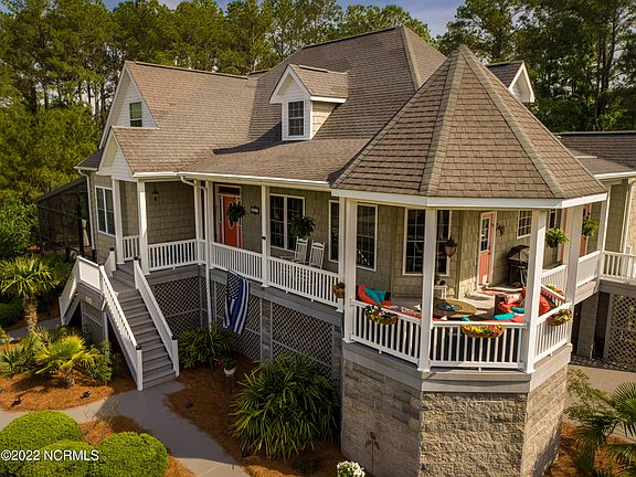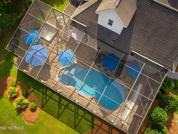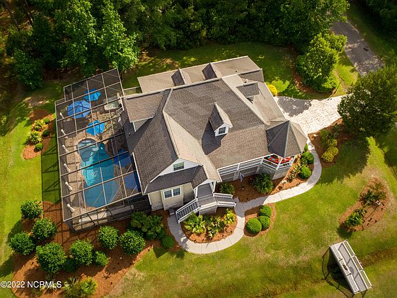 Meticulously maintained WATERFRONT home, in gated community, with 24/7 security. A quiet, serene vacation awaits you daily in your own screen enclosure w six seated hot tub. Heated/salt water pool, has laminars, and electric cover. Professionally landscaped w/sweeping views, from your large, covered front porch, with custom glass & granite propane fire pit. Shaded screened-in back porch has three ceiling fans to help take in the serenity of your private, wooded oasis. Your private dock will accommodate motor, or sail boats. Fish off of your own dock, or just sit & take in the gorgeous sunsets. Home features custom window treatments, crown & chair molding & fans throughout. Living room & dining room have incredible, cherry hardwood floors, a gas fireplace, with a built-in to accommodate your TV. Eat in kitchen has stainless steel appliances, cherry cabinets, granite counters, pantry. Electrolux washer & dryer, a second full size refrigerator, utility sink & ample storage cabinets, and utility closet. Large main bedroom on main floor, w/bamboo flooring. En-suite bathroom w/walk in shower, jetted tub, walk-in closet & linen closet. Oversized sun room has eight double hung windows, w/tree top views, & custom barn door, that can be used as a spare bedroom, office, etc, French doors lead out to the screened-in back porch. Office has plenty of natural light w/laminate flooring. Nearby stairs lead up to two additional nicely sized bedrooms, and a bonus room. Double walk in closets in both bedrooms, bonus room has a mini fridge, wet bar and a built-in for a TV. Full bathroom, w/tub & another half bath, plus walk-in, attic storage areas. Interior office stairs, and pool enclosure, will lead you to the garage. It has 1692 sq ft of space w/shelves galore, a workshop & a third half bath w/utility sink, plus more storage beneath both porches. Many community amenities, close to beautiful historic New Bern, and a short boat ride to the ICW.