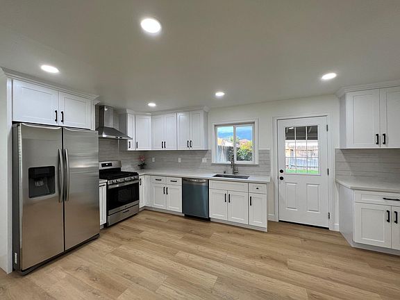 Private backyardNew ac unitSubway tile backsplashOrange treeQuartz countertopRecess lightsLuxury vinyl floors