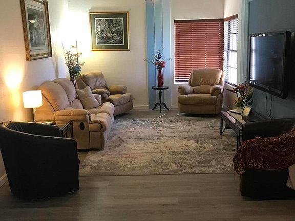This is an RV Owner's Dream Home. (2) RV Gates. Concrete driveway on the west side/w a 14' Gate, 50 amp electrical and RV dump. Room for a 40' RV. East side 16' brick path,10' RV Gate/w another 16' brick path into Ex-Large backyard. (3) patios. 3'x8'x30' deep mini pebble tec pool. (3) metal cactus gardens w/ solar lights. Covered heated Spa. Lighted 12' x 8' wood Pergola/w 2 benches & 7' bar/w 6 bar chairs. (2) 4'x7' BBQ soft covered Gazebos /w Gas/Charcoal Grill under 1 & a 5' stainless steel table under the other. Red wood cedar corral/w wood fire-pit table & 4 chairs. (2) sheds. UPDATES: Exterior Painted, Sewer line replaced 2025. Kitchen has custom white cabinets & granite countertops/w under mounted black granite sink /w 9' breakfast bar. Glass hood. Plank flooring in main areas. 18"x18" Tiled: Primary Bedroom, Walk-in Closet/w attached white Ironing board & shoe racks. Bath has exit door leading to pool area. Fm Rm/w wood burning fireplace. Also quiet second Fm/Rm area leading out to backyard. Inside LndyRm going to 2 car garage/w small step-up work area/w 220 AMP. Separate DnRm area. Step-down LvRm/w 65" TV. Front yard has an uncovered brick patio. 2' high brick border wall with purple flower hedge. Sunscreens on all windows. This is a must see!!!