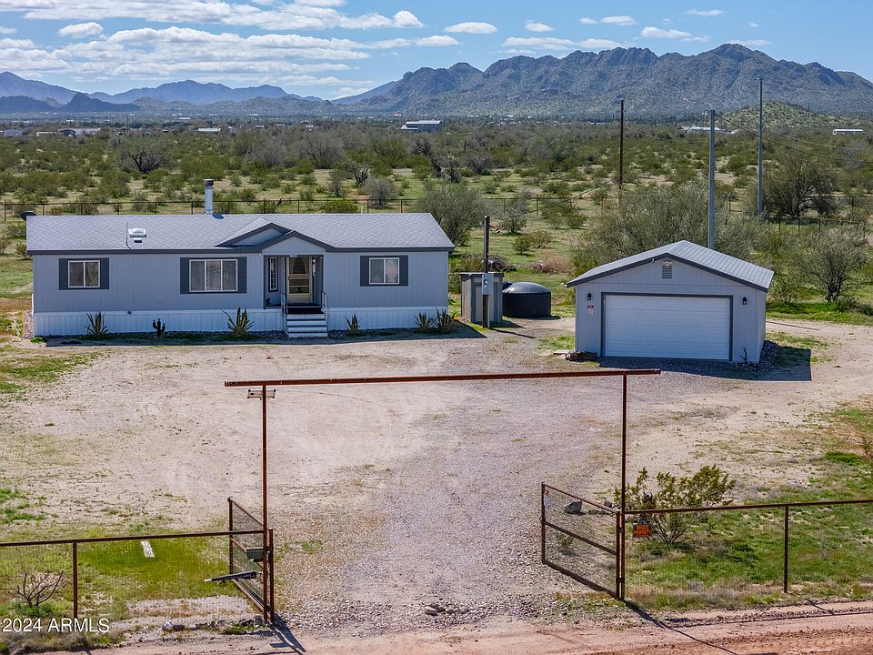 ''All The Essentials & Lots Of Extras!'' This Turn Key 3 Bdrm/2 Bath, Split Floorplan is Located on a Glorious Mtn View, Fully Fenced 3.3 Acre Property w/ A 2 Car Garage, RV Hook up & Large Patio Shed! The Automatic Gate Entrance Invites You Into an Immaculate Home Filled With Love & Dreams! Boasting Vaulted Ceilings & An Open Split-Floor Plan w/ A Large Sellers Suite & A Luxury Dbl Vanity, Corner Bath w/ Shower & Walk-in Closet! The Open Kitchen is Spiced w/ Lot of Cabinets & Counter Space & The Stacked Rock, Fireplace Is Centered In The Spacious Great Room! The Guest Wing Is Brightened w/ Skylights & 2 Additional Bedrooms & A Full Bathroom. Last, But Not Least, The Dining Rm Overlooks The Perfect Covered Patio Setting, As It Accents The Spectacular AZ Sunsets!