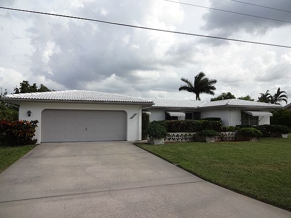 Great triple lot location in the Yacht Club. This well maintained tile roof home w/ two car garage features split floor plan with a large living area. The back yard has a cement dock and CBS boathouse with power and water. The highlight of this home is the 120' of seawall. If you looking for property to build your new home on, this sailboat access lot has quick river access and doesn't have a pool to contend with.