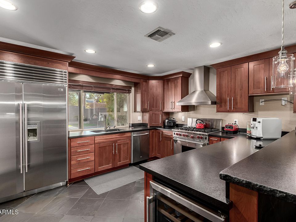 Gorgeous Central Phoenix home with Pebble-Tec pool and outdoor kitchen! Updated throughout, this home features a gourmet kitchen with cherry cabinets, granite counters, Sub-Zero refrigerator, Wolf 6-burner gas range, and wine fridge. Enjoy wood and tile flooring, remodeled baths with walk-in rain shower, newer windows, gas fireplace, and surround sound. French doors open to a resort-style backyard with a covered patio, built-in BBQ, sink, and sound system. Includes washer/dryer, skylights, recessed lighting, walk-in closet, and a storage shed/workshop. A perfect blend of style, comfort, and Central Phoenix charm!