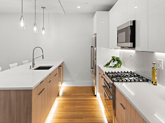 Introducing Residence I at FIVE32|34, a bespoke 2 bed and 1.5 bath bi-level condo with a captivating modern design. The main level welcomes you with a well-appointed kitchen featuring stylish cabinetry with custom lighting, quartz counters, an oversized peninsula, and high-end Fisher-Paykel appliances. The open-concept living area boasts lofted ceilings, a stunning chandelier, custom floor-to-ceiling windows, and a modern powder room. Ascend the stairs to 2 well-appointed bedrooms and a stunning bathroom with radiant heated floors. Every detail is meticulously considered for utmost comfort. The residence comes fully equipped with hardwood floors, surround sound, keyless entry, in-unit washer/dryer, and smart technology. Embrace the vibrant energy of the east side of South Boston and relish being steps away from exceptional dining, shopping, and entertainment.