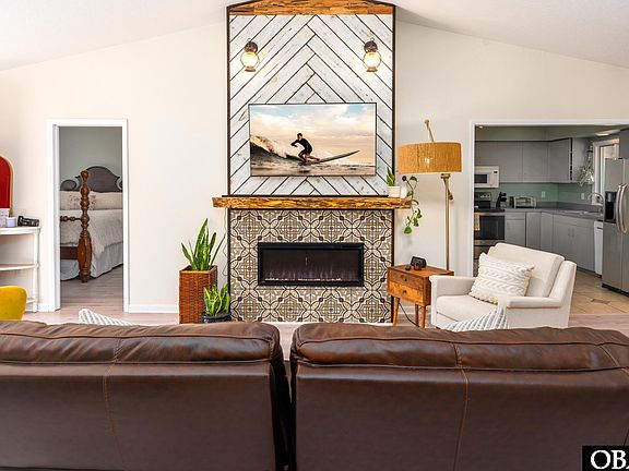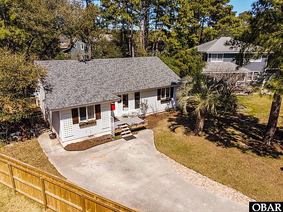 Step into this charming 3 bedroom 2 bath home on a quiet cul-de-sac in the heart of Kill Devil Hills. This cozy home features high ceilings through the living and dining room, luxury vinyl tile flooring and a shiplapped electric fireplace as the centerpiece. The primary bedroom includes an ensuite bathroom with custom tiled shower and walk-in closet. The rear door leads to an expansive back deck, fully fenced in yard, and a large storage shed. Recent significant updates include a new front porch in 2024, new LVT flooring in living room and primary bedroom, a beautifully remodeled ensuite bathroom, all new plumbing, new crawl space insulation, and a new HVAC in 2023.The roof was replaced in 2022, a new septic tank and drain field installed in 2021, and a new water heater in 2020. Conveniently located between the beach and the bay, this home is a short distance from the sound side multi-use path, multiple sound access points, the Wright Brothers Memorial, parks, grocery stores, and so much more. There are numerous beach accesses nearby and you have the option to join the Landing Lot Owners Association for access to the community dock and boat ramp. Come check out this must see home for yourself!