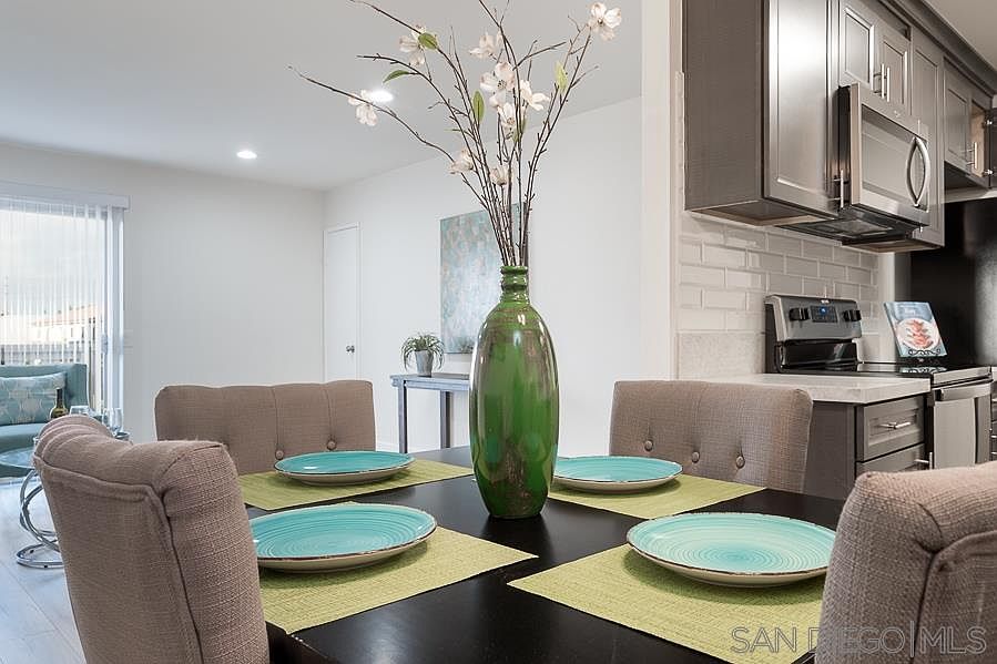 To view, please call (858)663-3256. This top floor, 2 bedroom, 1 bathroom, end-unit home has been freshly upgraded! Property features include a newly remodeled kitchen outfitted with new stainless steel kitchen appliances, new shaker cabinetry, subway tile backsplash and quartz countertops. Additional features include a new bathroom vanity, a living room balcony with a pool view, freshly painted interior, stacked stone accent wall and vinyl flooring throughout.