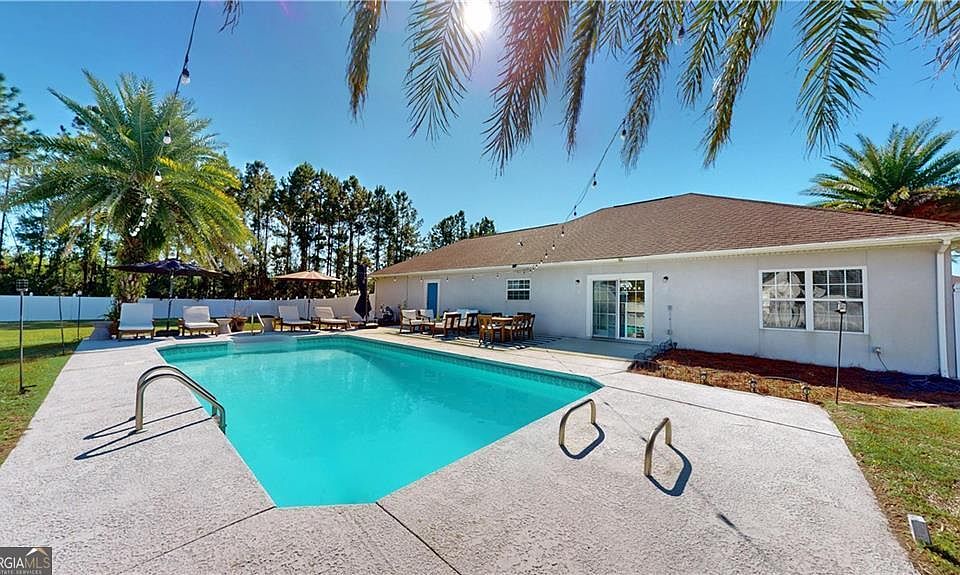 At this home, escape begins the moment you step outside - a broad, breathing backyard that opens to a shimmering pool, the kind of place where long afternoons melt into golden evenings, and summer feels endless. And when you want salt air instead of pool water, you're just 14 minutes from your driveway to toes in the sand on Jekyll Island. With 0.97 acres, there's room to stretch out, plant roots, and build the life you've pictured. Inside, sunlight pours through arched windows and vaulted ceilings, warming the wood floors and framing soft views of the pool from the living room, dining area, kitchen, and a guest room. The split floor plan keeps the primary suite on its own side, complete with a walk-in closet, double vanities, a shower, and a garden tub. Outside, the stucco exterior requires low maintenance, and a two-car garage, along with a workshop/storage space, adds everyday convenience. Be sure to take the 3D tour to see every room.