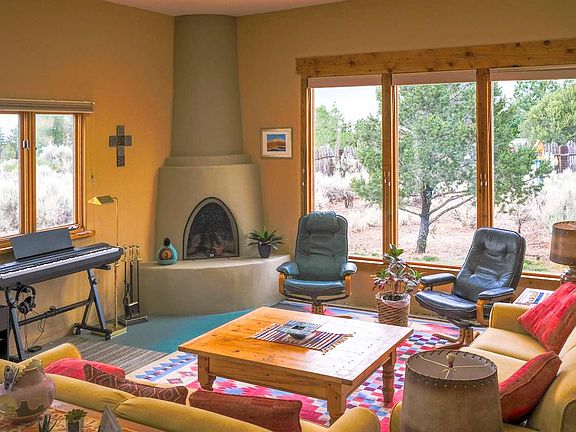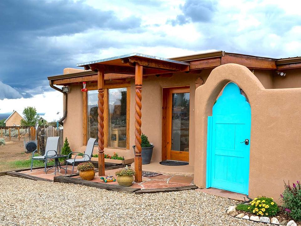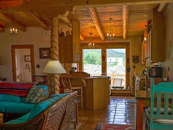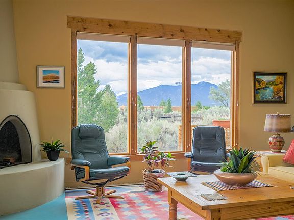 Welcome to your own oasis nestled up in the foothills of Taos. As soon as you set foot on this property you'll notice the attention to detail, flower beds meticulously maintained, elegant corbels add to the hefty built carport, wood horse fence creates clear boundaries, and flagstone patios adorn the exterior. Electric gate opens into the coyote fenced yard where a spacious two car carport is located. Coming in through the front door you're greeted by a cute light filled mudroom before opening up into the spacious living room with an adjoining kitchen. The entire house is filled with natural light from the many windows providing excellent views of the surrounding property. The addition off of the main living room is incredibly spacious, enough to host large dinner parties and a bunch of other indoor activities. Enjoy the warmth of the vibrant kiva fireplace while soaking in a grand view of Taos Mountain. A sunny hallway leads into the master bedroom with a on suite bathroom. The guest bedroom and master both have plenty of storage above closets. The enclosed patio is perfect for soaking up the sun or enjoying a meal outdoors. This home has a private well and town water hook up. Town water is used for irrigating the lawn and can be switched to the main source if needed. The large shed has two enclosed storage areas and one open, plenty of space for all your outdoor toys and garden equipment. Relax in the hot tub, enjoy the scenery, take it easy. Since the owners bought this property in 2014 they have put over $110,000 into maintaining and adding to it, please see associated docs. This property comes fully furnished other than a few personal items labeled in the exclusion list.