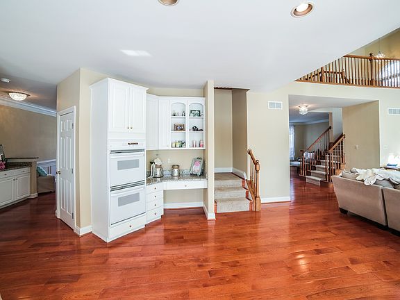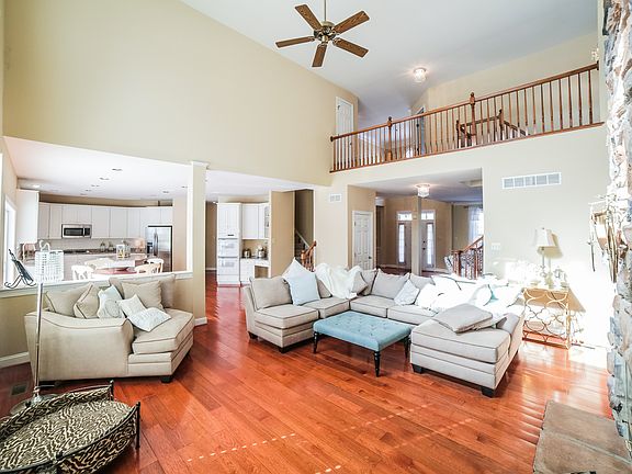 Former model home in the last section built at the prestigious Talamore Community. This home boasts a dramatic open floor plan with a vaulted two story foyer with balcony overlooking the entrance and the great room. As you enter the house there are no division walls left or right of the foyer to obstruct your view or path to the living room or the dining room making it an ideal layout for entertaining. There are two staircases conveniently spaced to access the upstairs from the great room which features a Romeo and Juliette window on the landing and from the more private back hall entry way from the kitchen, garage, private library, and laundry area of the home. The dining room is equipped with a convenient serving station just outside the kitchen at the entrance to the dining room. Upgraded lighting...elegantly lights up the house. The kitchen is fitted with high cabinets with clean lines, double oven, stainless dishwasher, stainless microwave, oversized island and a stylish double sink. The breakfast room is bright with the morning sun and the great rooms wall of windows lets lots of light into the large room. The vaulted built ins on either side of the floor to ceiling stone work around the gas fireplace add a majestic focal point to the room. The breakfast room opens out onto an expansive deck in the backyard. From here you can look up to the offset master bedroom deck and imagine the views looking out over the golf course. If your looking for more privacy the plantation shutters can be closed up in many of the rooms of the house. The master suite has a tray ceiling, sitting room, a massive walk-in closet and an expansive master bath with Jacuzzi jetted tub. All the baths have tile flooring and elegant tiled shower and tub finishing touches. There is hardwood throughout the 1st and second floors except two of the bedrooms which are fitted with wall to wall carpeting. The heating and cooling system was completely replaced and includes a humidification system and electronic filtration system. The decks were refinished, the garage doors were upgraded, a whole house vacuum system, 3 and 4 part crown moulding packages are just a few of the upgrades included with this house. Ohhh and don't forget to ask how many rounds of golf you get included with your association fees!