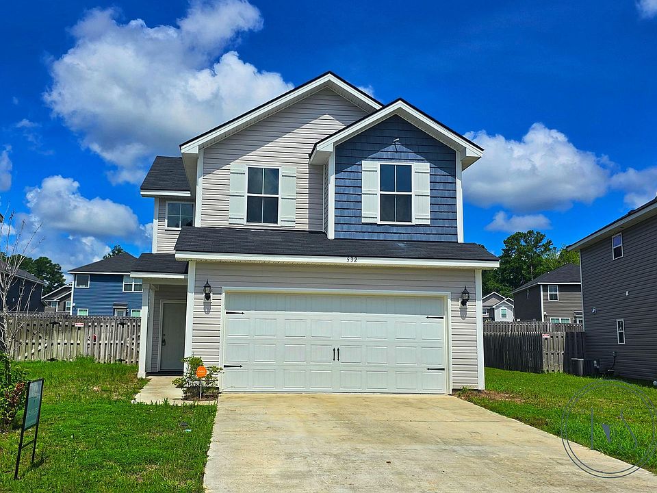 This spacious 3-bedroom, 2-bath home offers 1,462 sq ft of comfortable living space and a fenced backyard for added privacy. The open-concept main floor features stylish LVP flooring throughout the living and dining areas, and a galley-style kitchen equipped with stainless steel appliances, granite countertops, tile backsplash, and a convenient pantry. Upstairs, you'll find all three bedrooms, a hall bath, and a flex spaceperfect for a home office or reading nook. The master suite includes a vaulted ceiling, walk-in closet, and private bath with a separate tub and shower. Carpeting adds warmth to the upstairs hallway and bedrooms. Additional features include a stackable washer and dryer (tenant responsible for maintenance), a 2-car garage, and a prime location close to Hinesville's best shopping, dining, and entertainment! Pet friendly!* (One time, non-refundable $250 pet fee may apply, per pet, up to 2 pets max).