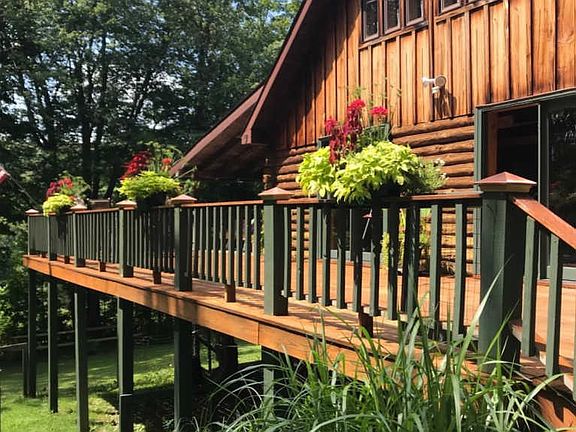 Own your own woodland Retreat. Situated on 3.8 acres with your own pond , truly a home for all seasons.Three bedrooms, three full baths, open floor plan with vaulted ceilings and true log walls. This log home is nicely tucked at the end of the driveway with a large wrap around deck with roof over part of the deck and embraces distant views. the center of the home is anchored by a massive stone fireplace. Two of the bedrooms are on the main floor with the master on the second . The basement has a large family room with a wet bar area, and a wood stove for that Log house warmth. Also a full walk out to the grounds from the family room. A must see.