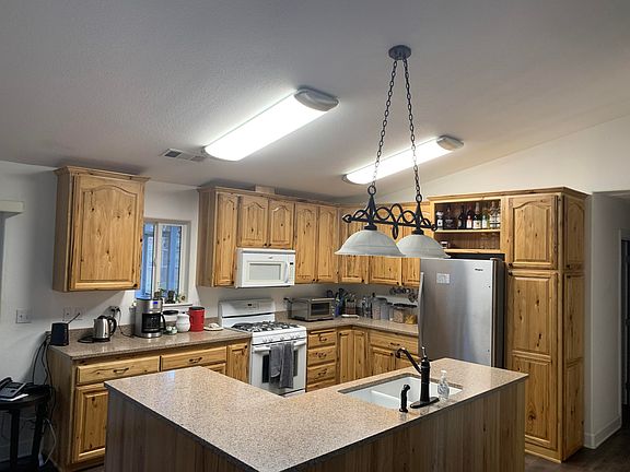 Country ranch style home located on 13 acres. Home has 3 bedrooms, 2 baths, with attached garage. Silestone counter tops highlight the open space living, dining, and kitchen. The site includes a second detached workshop 40 x 60 The has 110VAC service and the second garage is equipped with 220VAC service. The site is apt for horses, as some neighbors have horses. Buts up to BLM lands. SVE is power provider which keeps the electrical bill down.