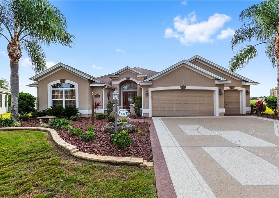 NO BOND! HIGHLY DESIRABLE LOCATION! POOL! GOLF COURSE FRONTAGE! GOLF CART GARAGE! WOW, this home has it all! Enjoy MILLION DOLLAR VIEWS of the Amelia Championship Golf Course from this significantly expanded LANTANA in the Village of MALLORY SQUARE - just a stone's throw from Lake Sumter Landing! This beautifully remodeled home has been stretched to over 2700 square feet of under air living space along with 1700+ square feet of screened outdoor living space that boasts an outdoor kitchen, pool, and hot tub! Three huge bedrooms plus three baths! The luxurious Master suite includes a sitting room and a home office! Gorgeous 17,000+ sq foot lot complete with putting green and waterfall make this a truly unique property! Sale will be subject to a 5 month seasonal rental commencing on January 1st. HURRY!... opportunities like this don't come along every day!