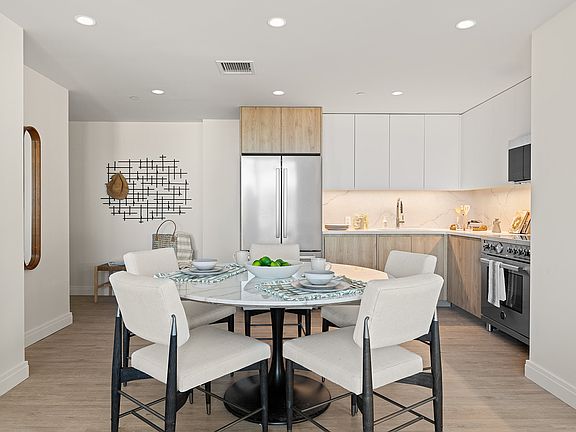 Every residence is crafted with comfort and sophistication in mind, featuring wide-plank wood-style flooring, multiple closets including walk-ins, and a custom Italian open-concept kitchen with quartz countertops and premium Bertazzoni stainless-steel appliances. The spa-inspired bathrooms feature modern fixtures and sleek vanities, while thoughtful details such as an in-unit washer and dryer, central air and heat, Wi-Fi-enabled smart locks, and custom window treatments ensure every convenience of modern living.