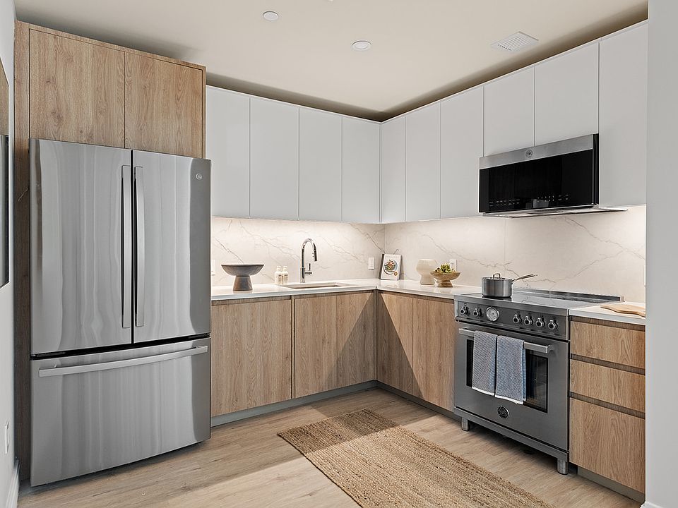 Every residence is crafted with comfort and sophistication in mind, featuring wide-plank wood-style flooring, multiple closets including walk-ins, and a custom Italian open-concept kitchen with quartz countertops and premium Bertazzoni stainless-steel appliances. The spa-inspired bathrooms feature modern fixtures and sleek vanities, while thoughtful details such as an in-unit washer and dryer, central air and heat, Wi-Fi-enabled smart locks, and custom window treatments ensure every convenience of modern living.