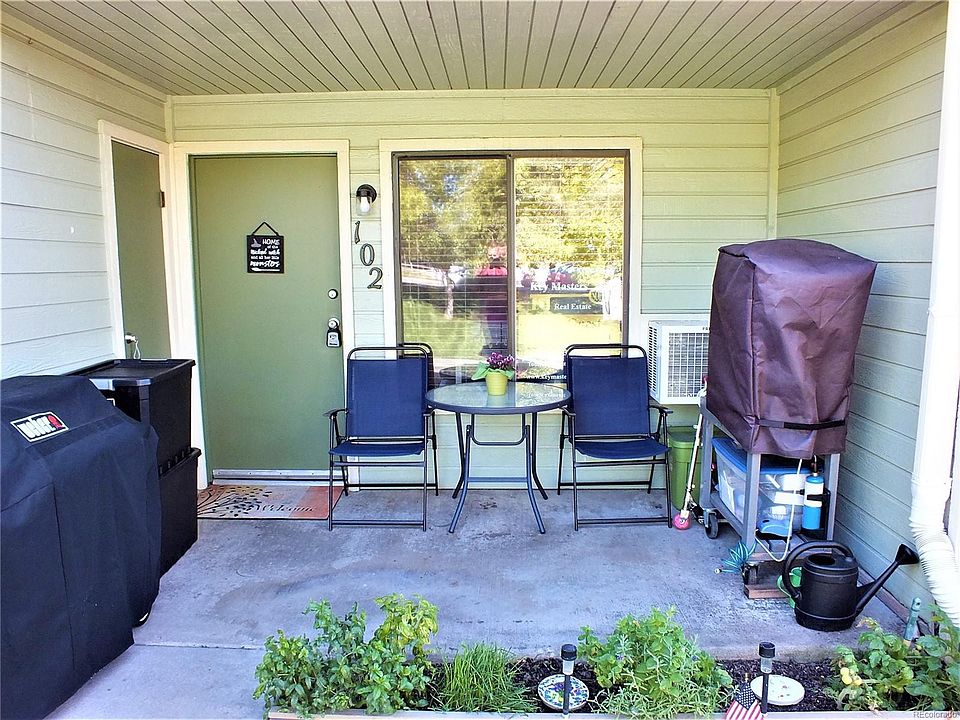 Fantastic opportunity for ground floor one bedroom condo in Stonecreek Park with view of pool and greenbelt. Featuring living room with bamboo flooring and fireplace. Kitchen offers upgraded concrete counter top and breakfast bar. Oak kitchen cabinets and includes refrigerator, dishwasher, microwave and stove. Includes newer room air conditioner. Includes community pool, water and heat! Front covered patio with small common yard area and storage closet. Convenient location close to shopping, High School and Castle Rock Park!