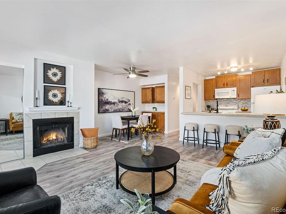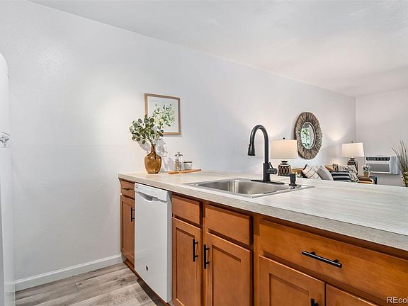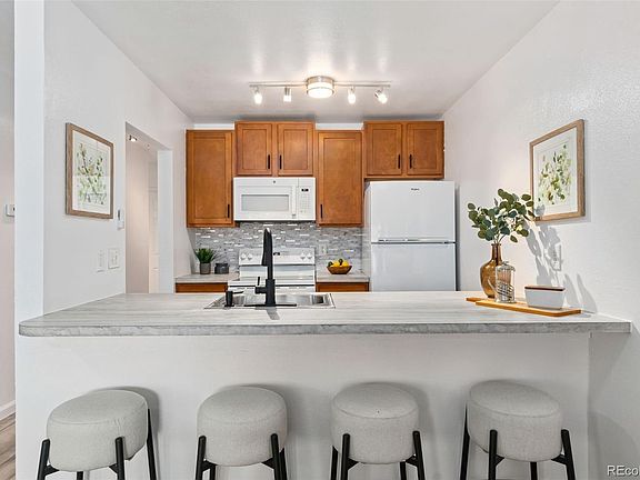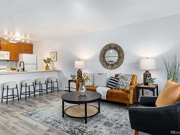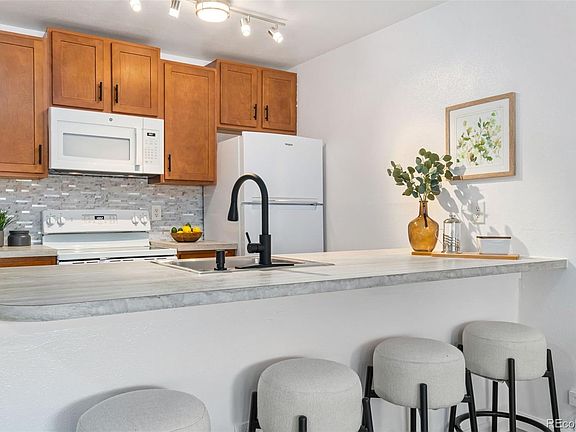 Beautifully updated ground floor condo a stones throw from thriving downtown Castle Rock and a block north of the rock and Rock Park! Unit boasts upgrades inside and out! Complex has recently been repainted with a timeless and modern color scheme, giving it new life. This turnkey unit boasts new flooring, BRAND NEW kitchen appliances, modern fixtures, pulls, and updated paint! This floor plan offers an optimal open concept between the eat-in kitchen, countertop dining and living room. The spacious primary suite has a walk-in closet complete with built-ins, and a beautifully updated, private full bath. The sizable secondary bedroom with walk-in closet is perfectly situated across the 3/4 bathroom, also conveniently located for guests! Stackable washer and dryer stay and unit conveys with the use of two designated parking spots and exterior storage unit! Community offers outdoor volleyball court and pool and HOA covers water, sewer and trash. This is the only property available in charming Castle Rock under $300k! Take advantage of the outdoors and trail systems of Rock Park just beyond the complex or enjoy lively downtown Castle Rock’s abundance of restaurants, parks, community events and more.