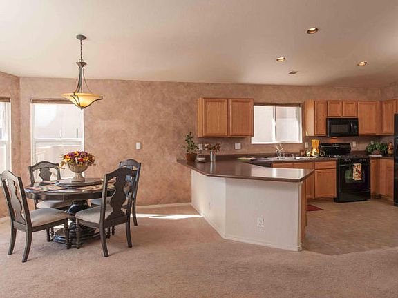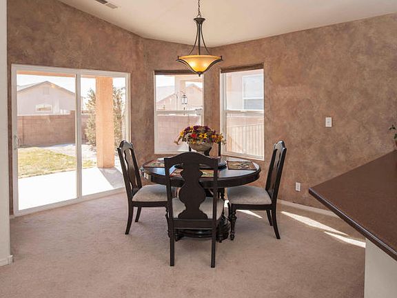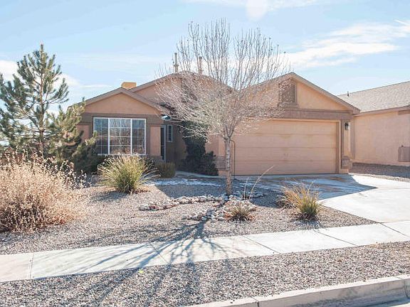 Neat, clean move-in ready single story home in the master planned community of Northern Meadows. Popular open, bright DR Horton Antelope floorplan with approximately 1385 square feet, 3 bedrooms, 2 full baths, great room, family dining room. Cathedral ceiling, plant ledge, bonco and ceiling fan in great room. Kitchen includes breakfast bar, pantry, refrigerator, built-in microwave, self-cleaning gas stove/oven, lots of cabinet and counter top space. Master suite with clerestory window, large walk-in closet with built in shelving, full bath with garden tub and linen closet. Xeriscaped front yard. Walled backyard with covered patio, grass, automatic sprinklers. Two car garage with opener. Walking trails, parks, close proximity to Rio Rancho City Centre, schools, golf courses and I-25.