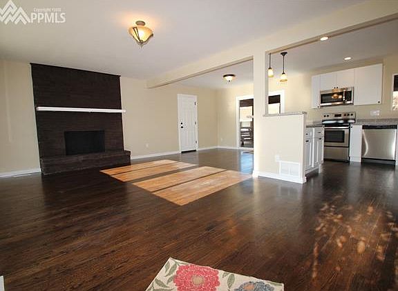 Situated on nearly 1/3 of an acre at the back of a cul-de-sac, this spacious remodeled four-level floor plan with 4 bedrooms, 3 baths, is remodeled and move-in ready. So close to Fort Carson, plus close to a beautiful park with Frisbee golf and shopping just around the corner. The main and upper levels boast beautiful refinished hardwood flooring. The open-concept floor plan on the main level allows enjoyment of the wood-burning fireplace from the living and dining rooms, plus the kitchen too! On the upper level, the master has its own private ?? bath, and the additional two bedrooms on this level share a full bath. The lower level has a large family room with another full bath, plus a second walk-out to the back yard. The basement has a nice landing area, carpeted and includes a closet with shelves, which would make up nicely into a small office space. Pass through this room to the fourth large bedroom. The back yard can be enjoyed from the covered wood deck which has a walk-out from the main level, or from the covered concrete patio.